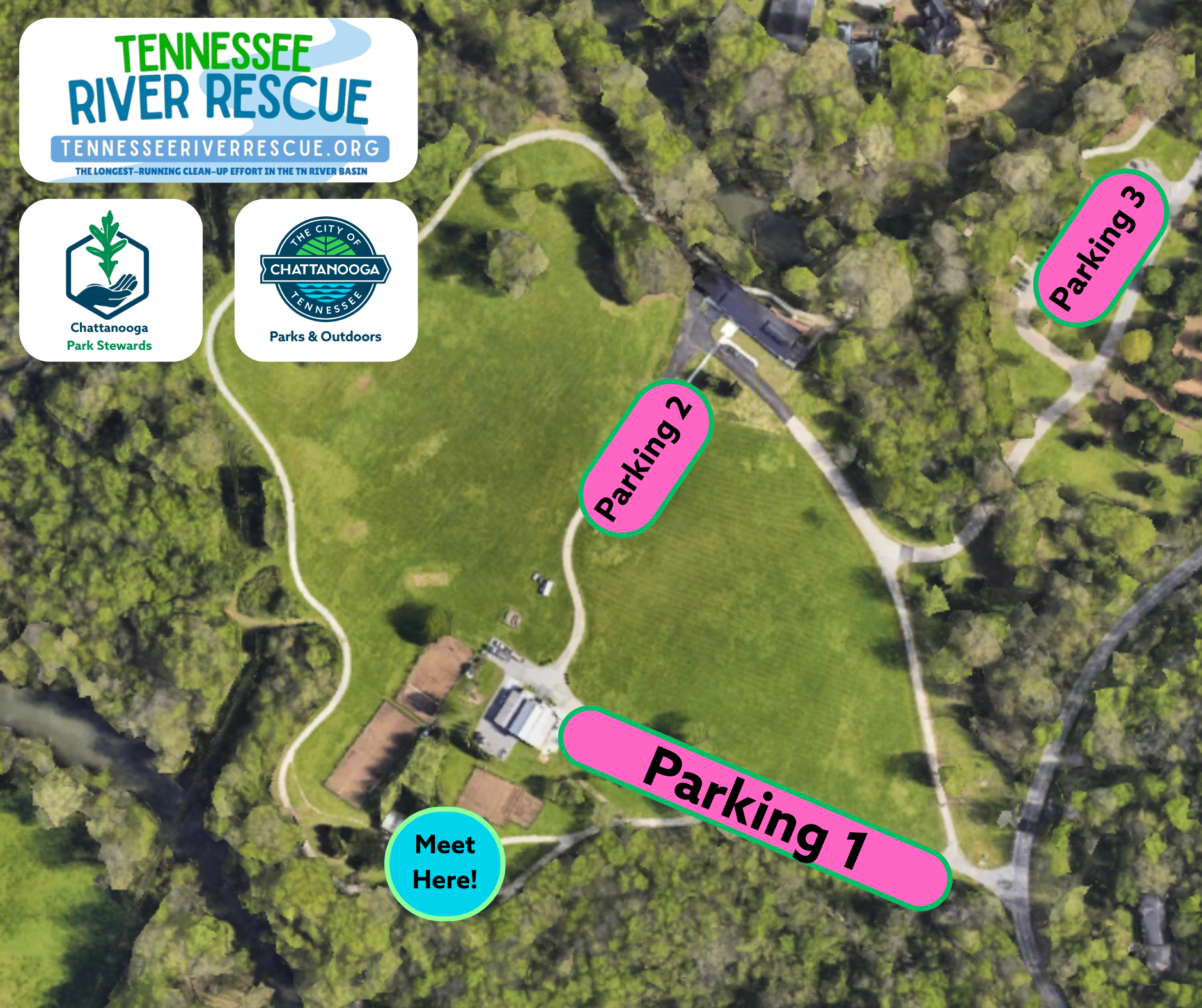 We have chosen Greenway Farms as our host site! There are many areas where people leave their trash, and it all makes its way to the creek, which makes it way to the river. Volunteers will be picking up litter all around Greenway Farms, not just around the creek. Please see the photo below for information on parking and meet-up points. Parking preference is ordered 1-3.
