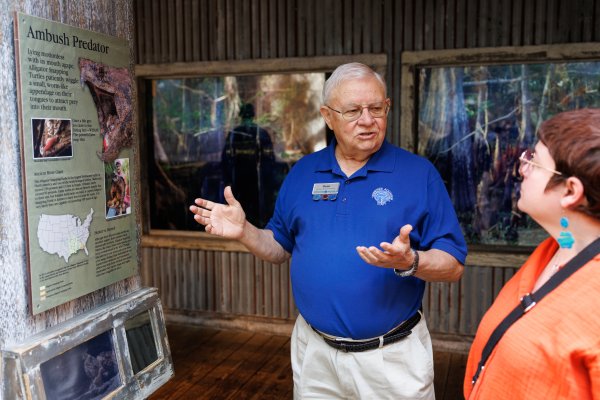 Education Volunteers are stationed throughout the galleries to interpret exhibits, animals, and plants by offering educational information to visitors through interpretation and storytelling.