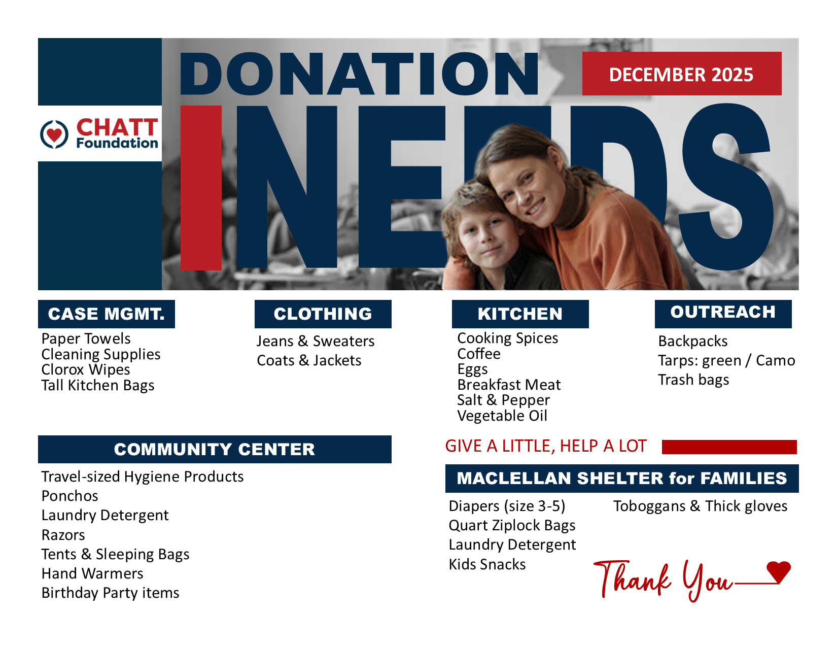 All donations can be brought to our main entrance at 727 E. 11th St.